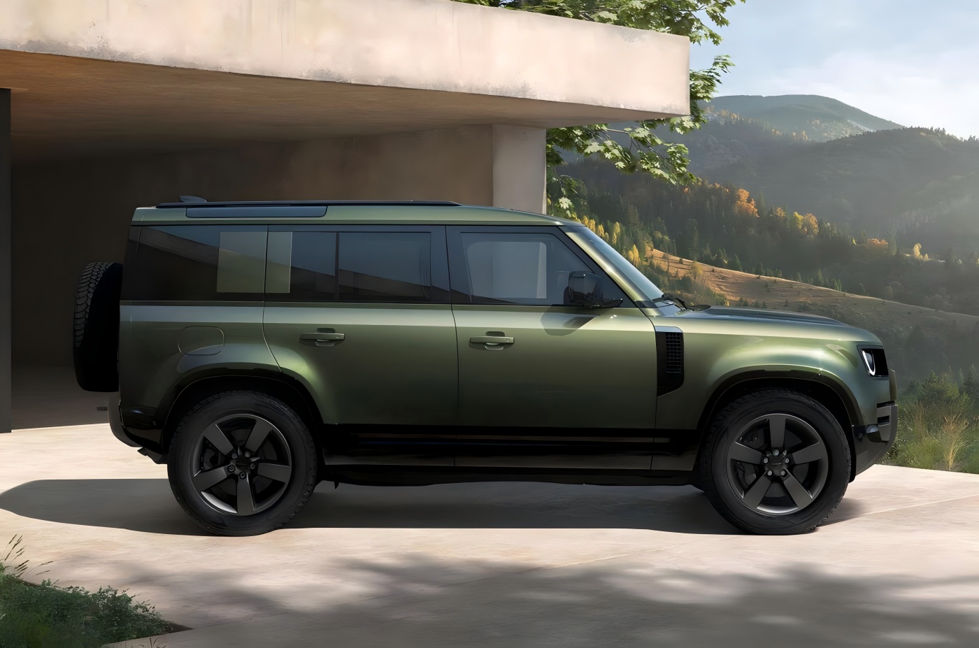 Lado. Vista lateral, o novo veículo dá continuidade ao estilo clássico do Land Rover Defender. A versão 110 adota um design de quatro portas, com amplos para-lamas dianteiros e traseiros, além de rodas de cinco raios e pinças de freio multipistões. As dimensões da carroceria permanecem inalteradas, com comprimento, largura e altura de 5.018/2.105/1.967 mm, respectivamente, e uma distância entre eixos de 3.022 mm.