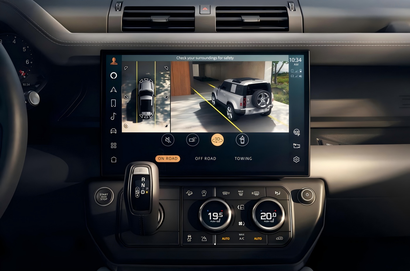 Interior. Em termos de interior, o layout geral do novo veículo não mudou muito. Ele ainda vem com painel de instrumentos totalmente em cristal líquido e volante multifuncional de três raios. A tela multimídia no meio do console central foi atualizada de 11,4 polegadas para 13,1 polegadas. Enquanto isso, o novo veículo adicionou um sistema de monitoramento do motorista. Este sistema de monitoramento está em conformidade com os regulamentos GSR2 da UE. Se for detectado que o motorista não está prestando atenção à estrada à frente, serão acionados alarmes de áudio e vídeo. No entanto, a assistência ao condutor pode ser desativada nas opções do ecrã da consola central. Além disso, o sistema de controle de cruzeiro off-road adaptativo da Land Rover também está sendo oferecido pela primeira vez no Land Rover Defender como um recurso opcional.