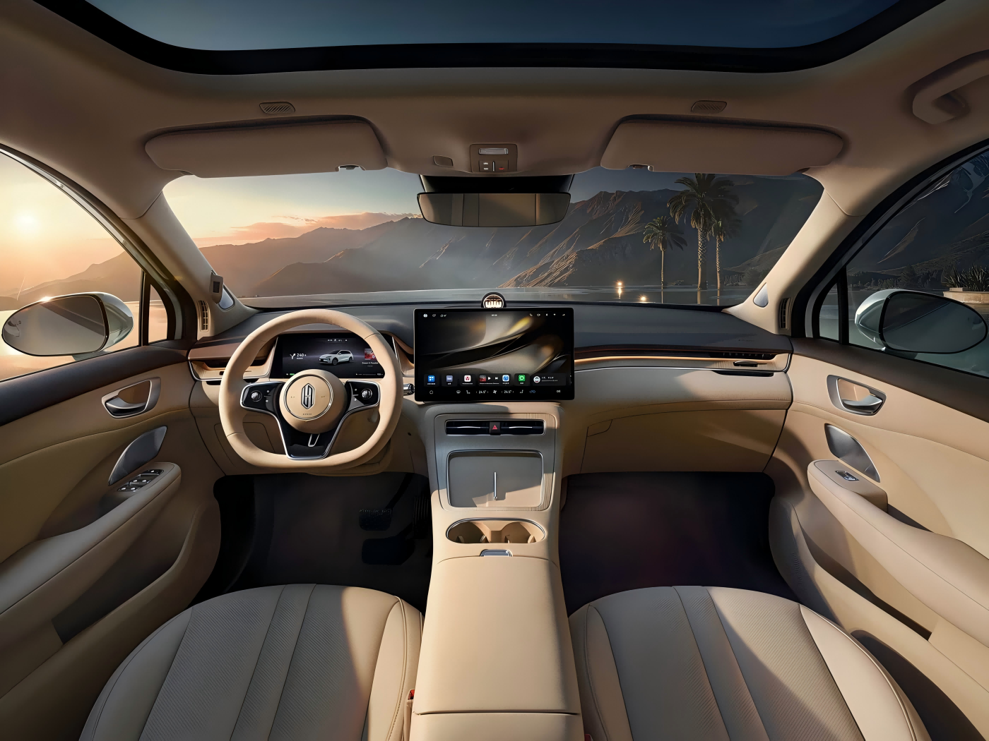 Oficialmente, uma imagem oficial do interior na cor Shaohua Apricot também foi divulgada simultaneamente. É combinado com um volante multifuncional de três raios, o icônico difusor em forma de estrela da família Harmony Intelligent Mobility, uma tela de controle central flutuante e um painel de instrumentos LCD completo, que deverá proporcionar uma excelente experiência inteligente. Enquanto isso, a parte traseira dos bancos dianteiros deverá ser equipada com interfaces HUAWEI MagLink, possibilitando a expansão dos dispositivos dos bancos traseiros por meio de suportes magnéticos. Além disso, com base no Harmony Cockpit, a ligação interativa multitelas pode ser realizada.